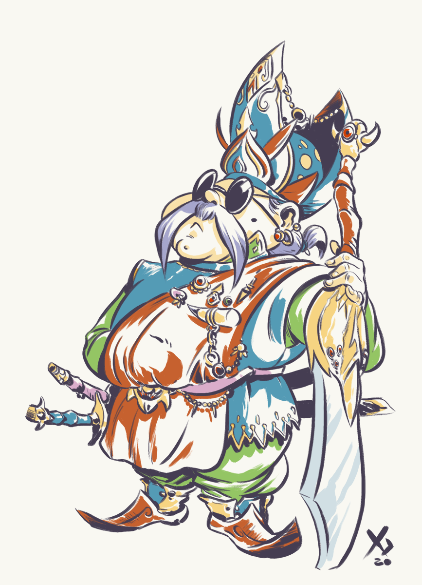 Melchior, the Guru of Life! Good chance to make some changes. I always thought he had a very playful personality, I see him as more of a swordmaster, a war hero, a flamboyant old man, somebody who likes to laugh and tell stories, possibly blind. Affable, open and mysterious all at the same time He didn’t even change his aesthetic when he time traveled, hinting at a deep love for his Kingdom of Origin so lets push that!