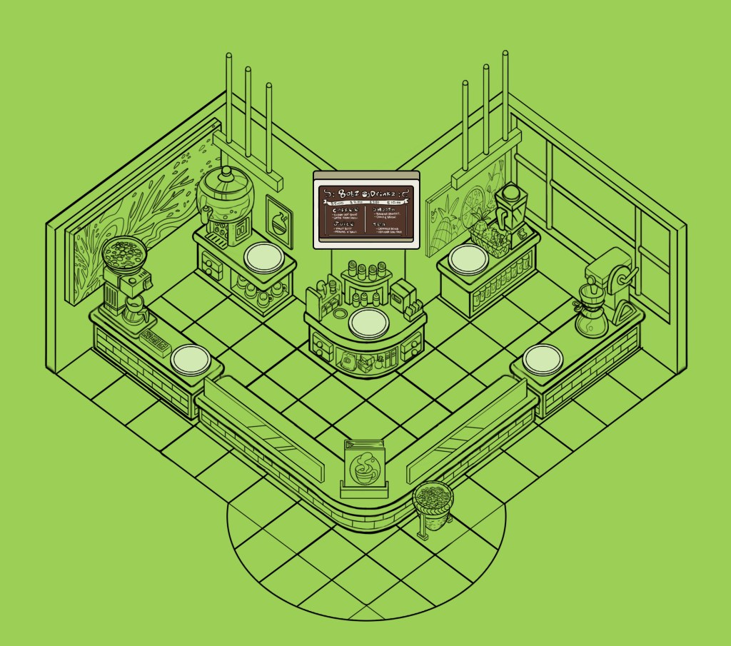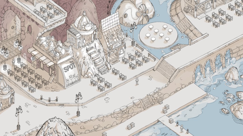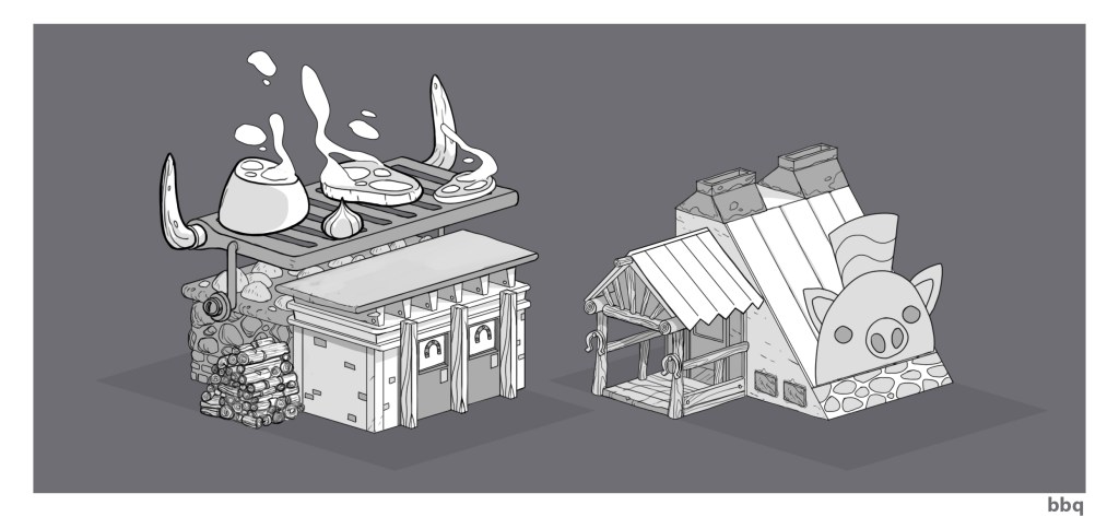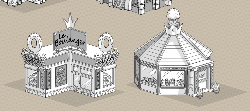 For the restaurants and their indoor stylings we went through a similarly rigorous process of revisions. Finding the right amount of detail, perspective and theming proved difficult but extremely rewarding. From the more “literal” designs to something that feels more pleasant and celebratory
