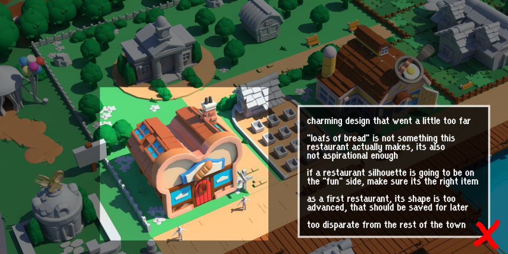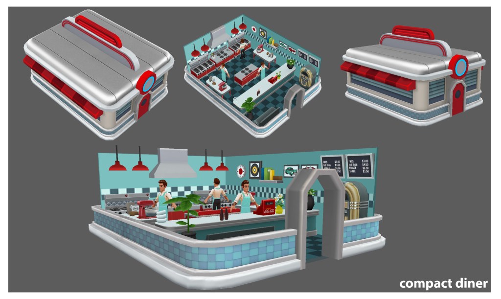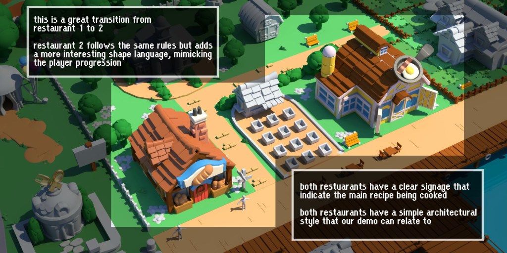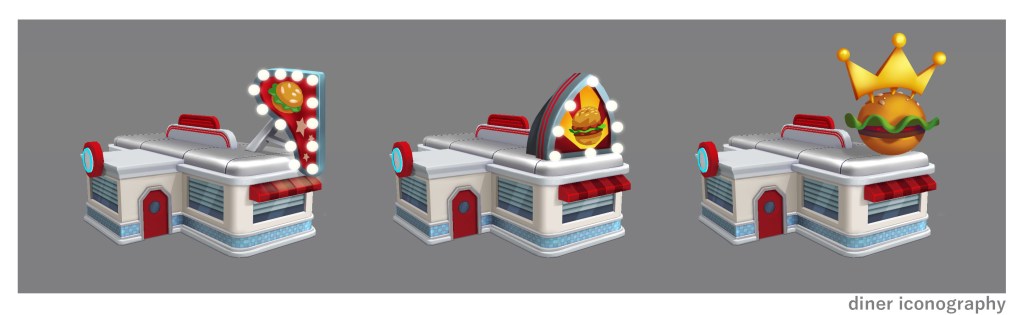 These designs, while were somewhat effective, felt entirely too safe and sterile. We didn’t want the player to feel like a line cook, we wanted to be more playful and aspirational. You can start seeing how we deliberately transitioned to the style that we ended up with by giving each restaurant a distinct, strong personality that carried it both outdoors at a more macro level and indoors at the micro level