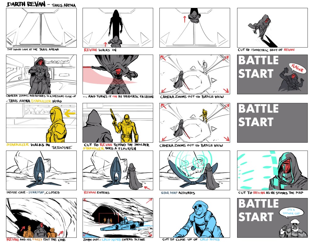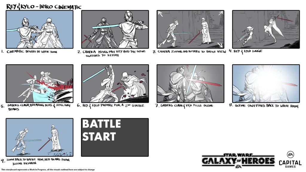 I was heavily involved with our cinematic work. Storyboarding every event, building them in Unity myself with our own custom tools. Below you can see the boards for the Kylo and Rey intro cinematic along with the final result in-game, the Chewbacca Legendary event cinematic is a good example of the marketing team recreating our in-game cinematic for promotional use, there are plenty more in the YouTube page